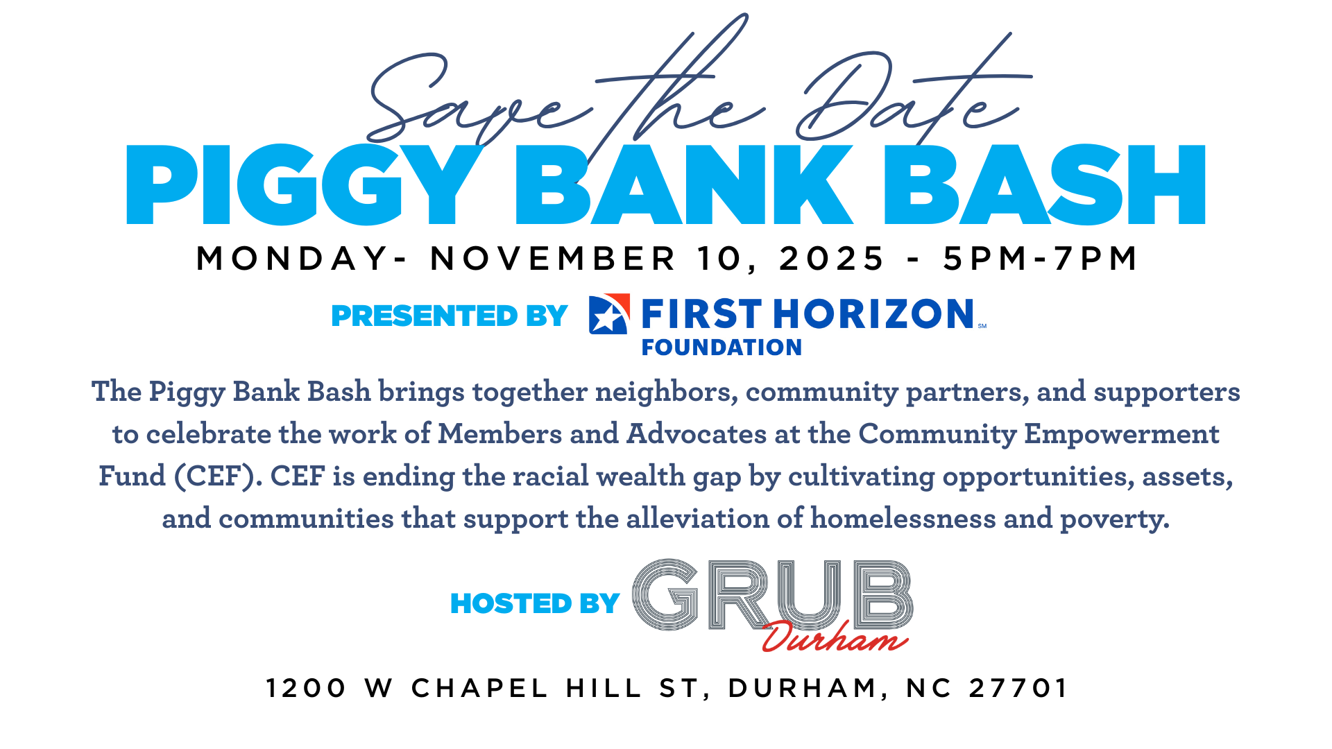 CEF’s annual Piggy Bank Bash will be held at Grub Durham, Monday, November 10, 2025 from 5:00pm – 7:00pm This year, we’re excited to offer donation-based tickets, with sliding scale options from $5 to $30.Your contribution supports CEF’s work — give what you can!
